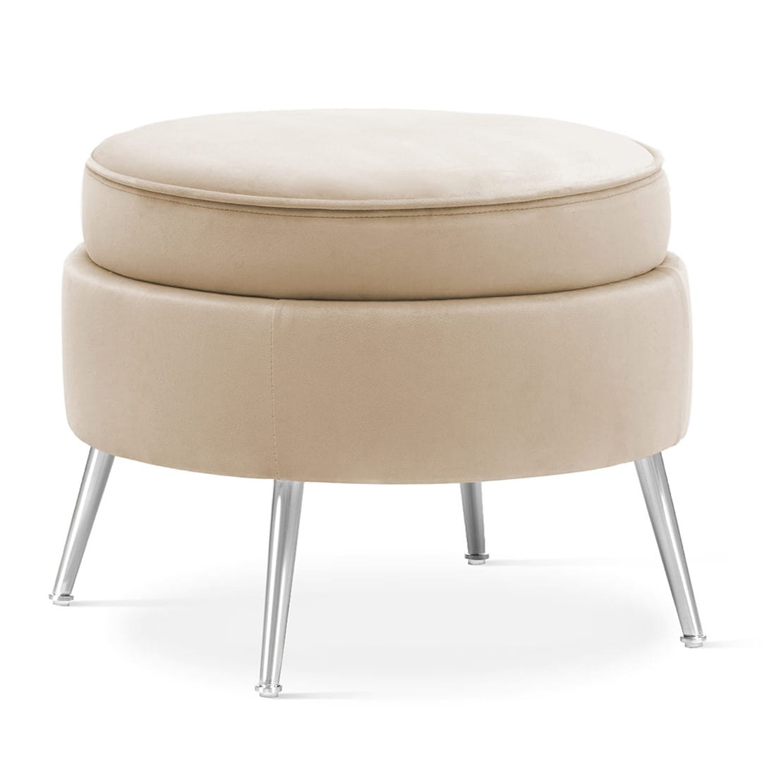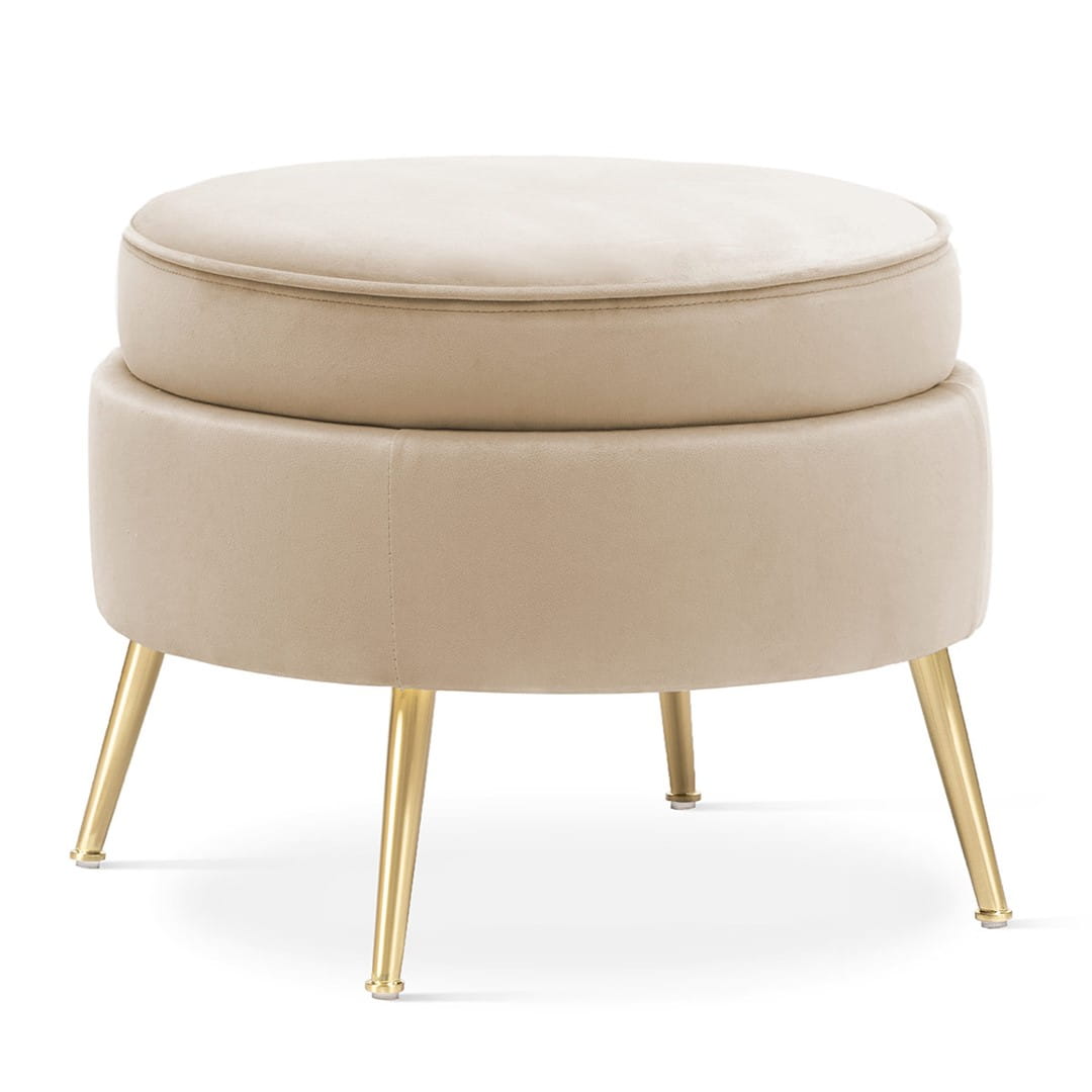 Tapicerowany okrągły podnóżek na nóżkach w kolorze złotym. Podnóżek dedykowany fotelowi Muszelka.