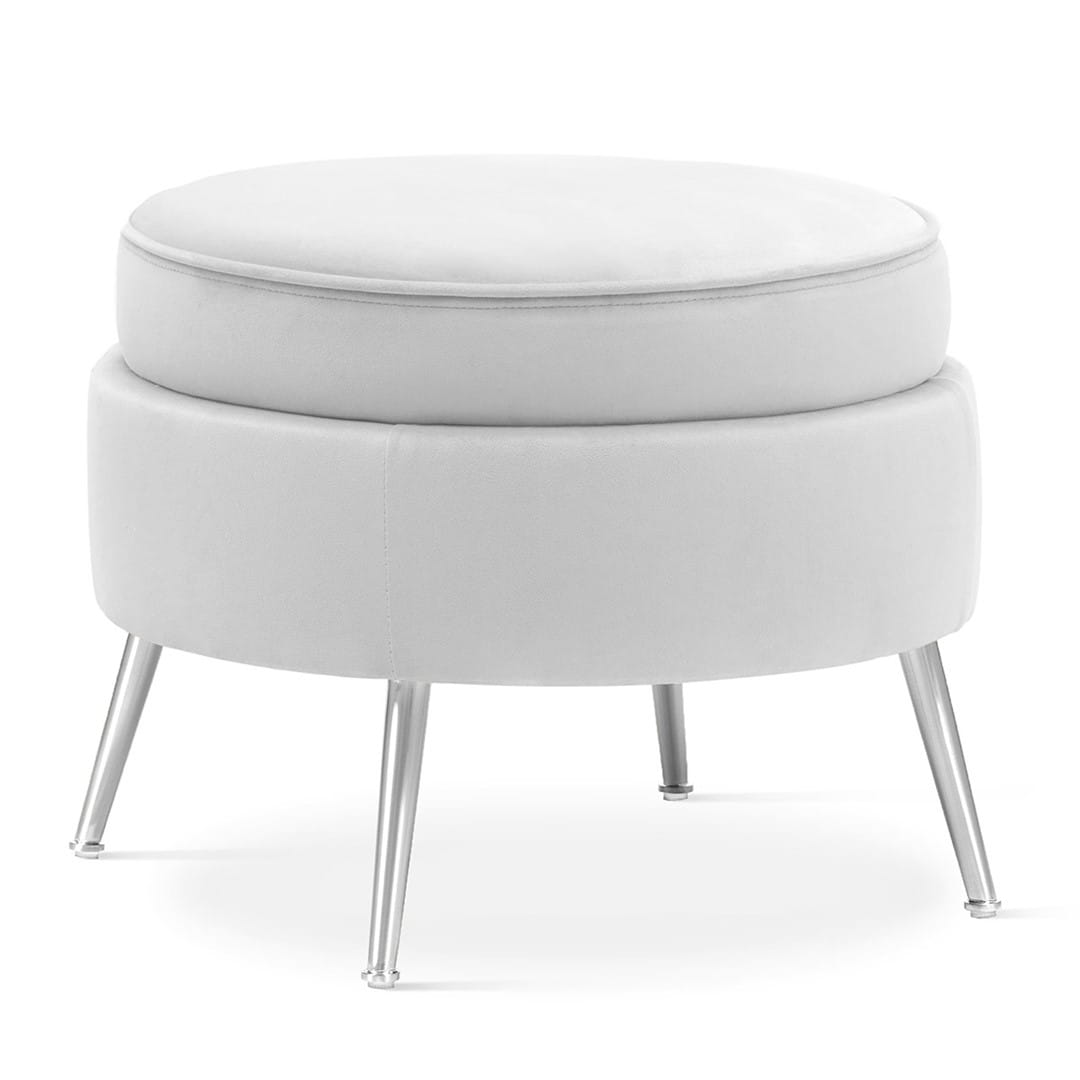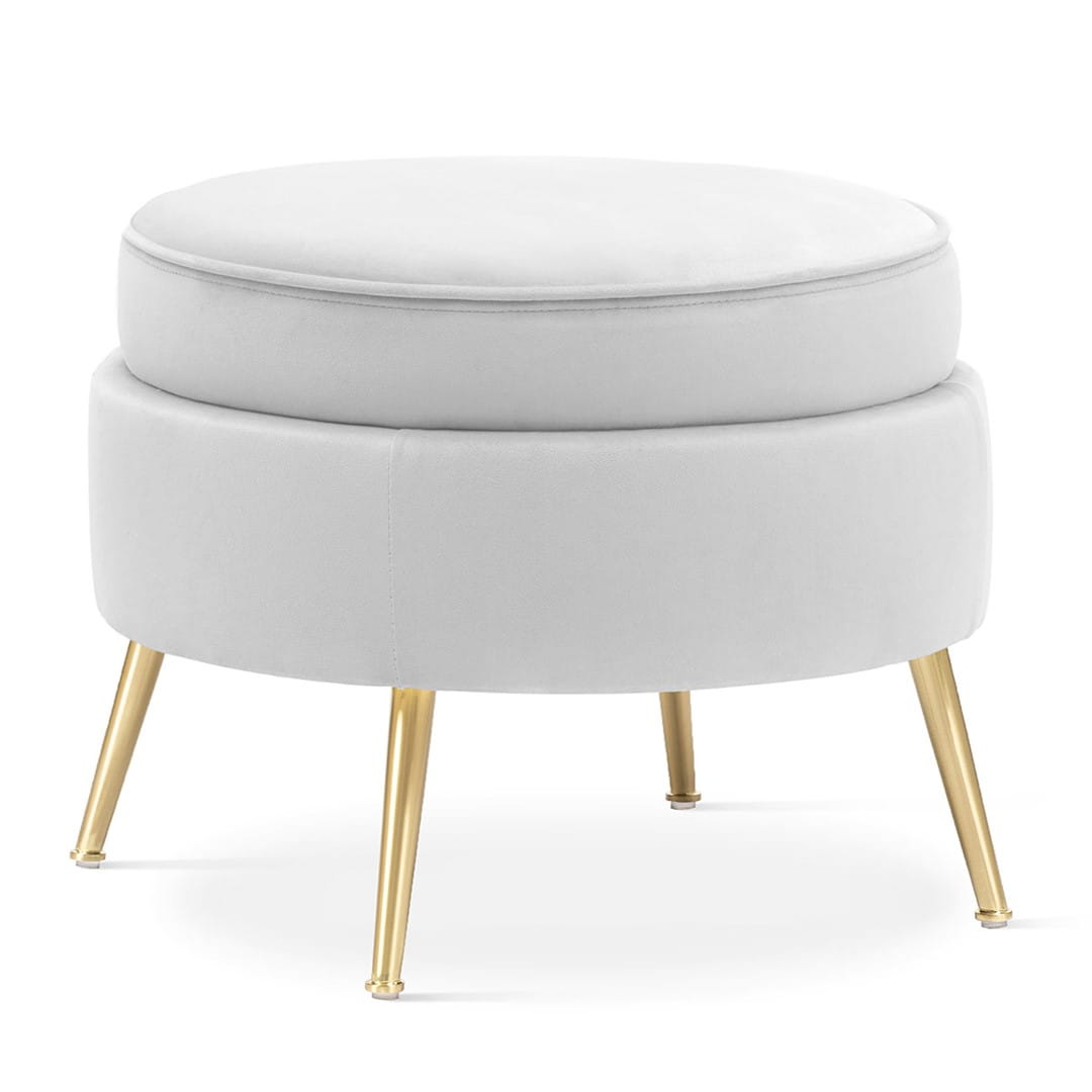 Tapicerowany okrągły podnóżek na nóżkach w kolorze złotym. Podnóżek dedykowany fotelowi Muszelka.